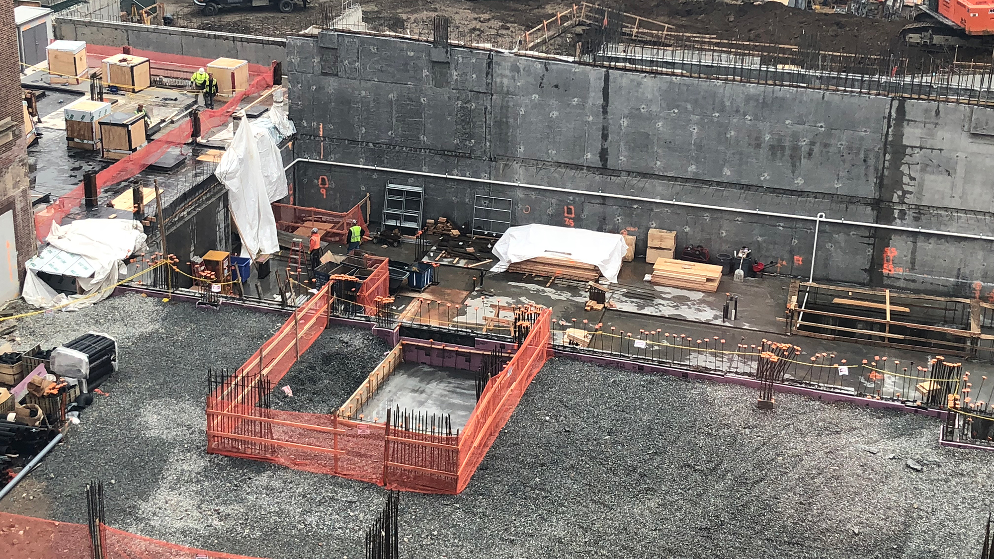 Our foundation is complete, and we have finished the complex mechanical and plumbing work needed in the “bunker” (in photo, at left)—a low, pre-existing building next to Brush that houses fire and water pumps and our main electrical panel. Work has begun on building the concrete pillars in the bunker that will help support the residence hall. Once these are complete, we should see the superstructure, or concrete frame, of the residence hall start to rise this spring.
