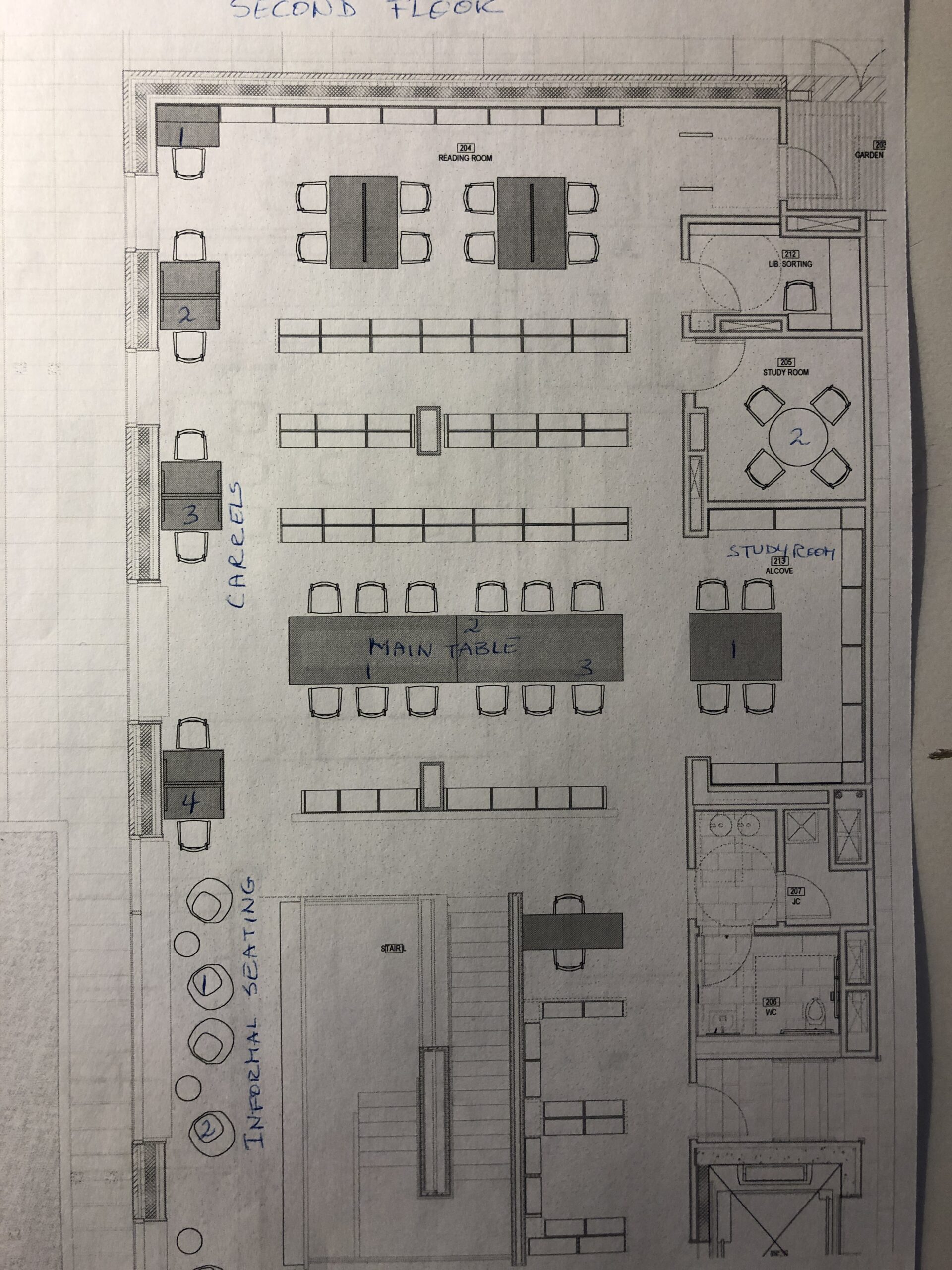 Appropriate spaces have been identified and numbered. There is a combination of tables, carrels and informal seating. They are physically distanced and are numbered. Those who want to use the Library must reserve a time slot in advance. Users are assigned two-hour slots, renewable at the discretion of the library staff if space is available.