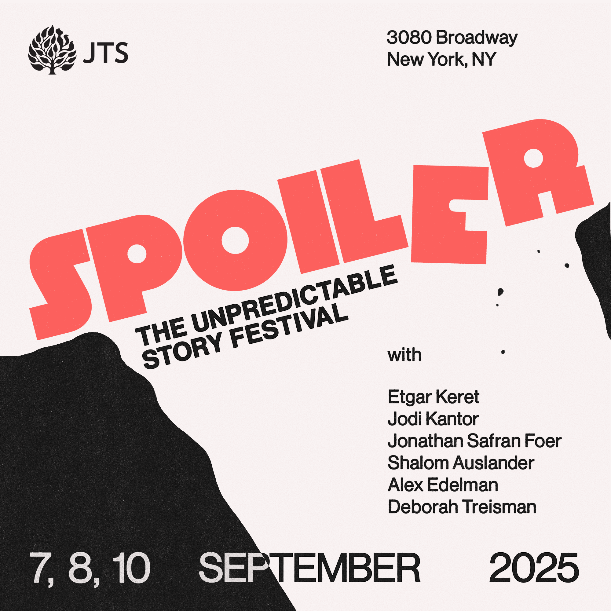 The SPOILER festival takes place on September 7, 8, and 10 at 7:00 p.m. at JTS, 3080 Broadway, New York, NY. Tickets for a single event are $36. A full festival pass for all three evenings is $89. Each event will be followed by a book signing.
