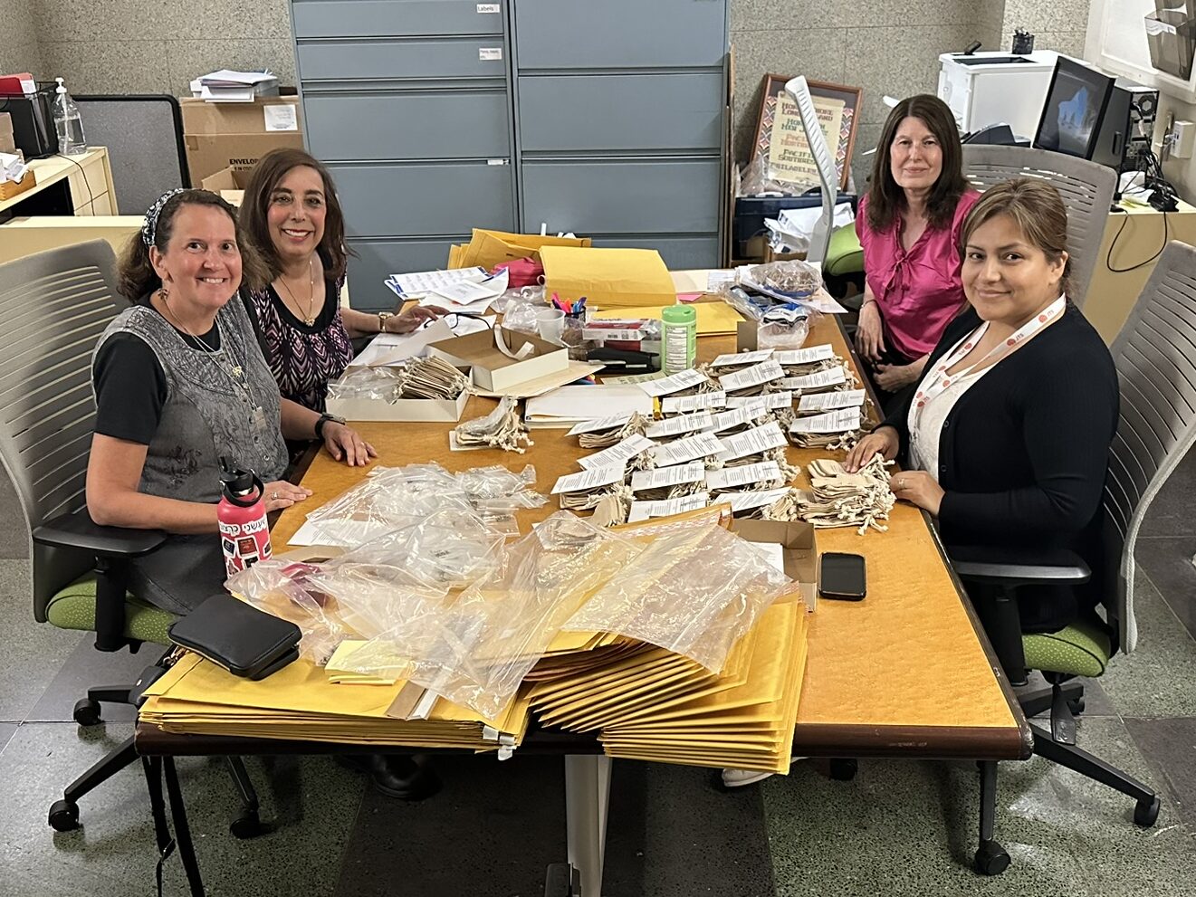 On September 29, once the remainder of the pins were released from U.S. Customs, it was Women’s League’s turn. Women’s League for Conservative Judaism executive director Rabbi Ellen Wolintz-Fields and digital content manager Karen Ballena, as well as Torah Fund vice chair communications, Shelley Szwalbenest and Torah Fund director Lisa Paule finished packing pins for the regions and for Torah Fund upper-level donors, sent individually. We also thank Torah Fund Legacy Society co-chair Donna Burkat and her husband for volunteering to pack pins on September 30, but the September 29 group was able to save them the trip by completing the task. It “takes a village” to get this done, and it would not be possible without our dedicated, enthusiastic volunteers. Torah Fund truly appreciates their efforts.